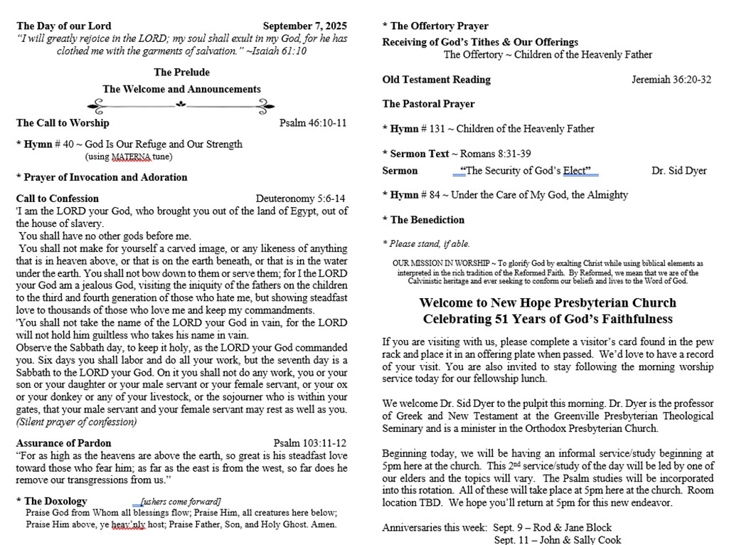 Most people would describe our worship as traditional, but we’re not fond of this description here at New Hope because we don’t feel that this title fully captures what we hope to do. Yes, we sing hymns out of a hymnal and we even have an organ. But our worship service isn’t structured the way it is simply for tradition’s sake or because it’s our preferred style. Rather, we believe that worship should be all about God, and not just how it makes us feel, so our service is built around a structure where God calls us to worship Him in his word and we respond. When we confess our sins (privately to God), we like to hear assurances of his forgiveness in the Bible. Church history is rich, so we love to sing old songs as well as new ones. What’s important is that all of our worship is focused on God and that it be with reverence and joy. Our service seeks to engage both the mind and the heart and includes the things we see God calling his people to do in the Bible, such as congregational singing, prayers, reading scripture, and the preaching of God’s Word.